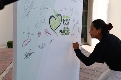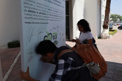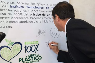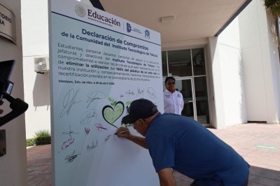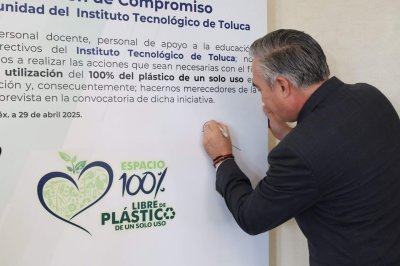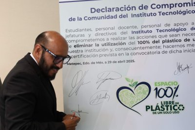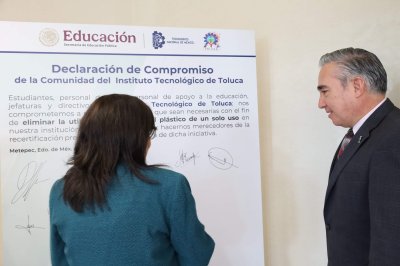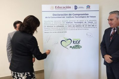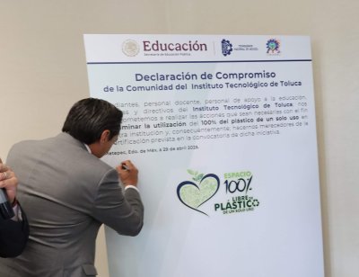 La declaración de compromiso de la comunidad del Instituto Tecnológico de Toluca con la iniciativa de la eliminación del uso del 100% de plástico de un solo uso, fue presentada por Chávez Sáenz y firmada, en primera instancia, por el director de la institución, y se sumaron todos los integrantes del presídium, quienes cada uno plasmó, con su firma autógrafa, el compromiso institucional y personal que lleva a todos para realizar las acciones que sean necesarias con el fin de eliminar la utilización del 100% de plástico de un solo uso en el Tecnológico.